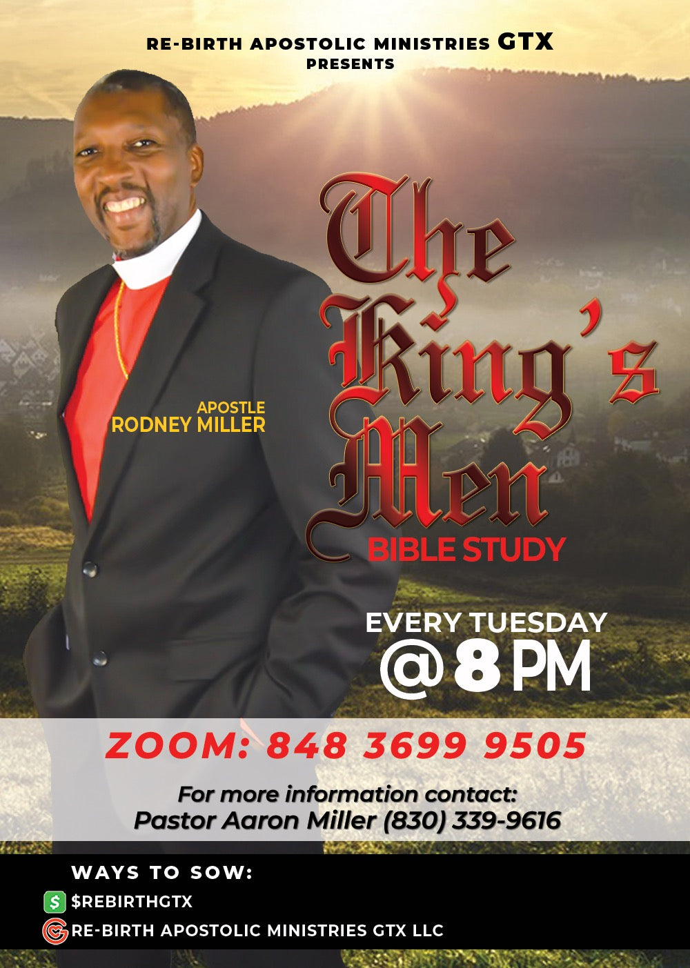 The King's Men weekly bible study is a virtual gathering that happens every Friday at 7 p.m. It is a safe space online for men to grow together, learn, and teach the Word unto one another. All men are welcome!