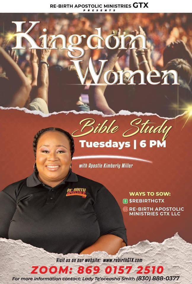 Every Tuesday night at 6 p.m. the Kingdom Women of Re-Birth GTX and others come together to study, teach, and learn the Word of God. It is a safe place to share experiences and pass on wisdom as women of the Kingdom.