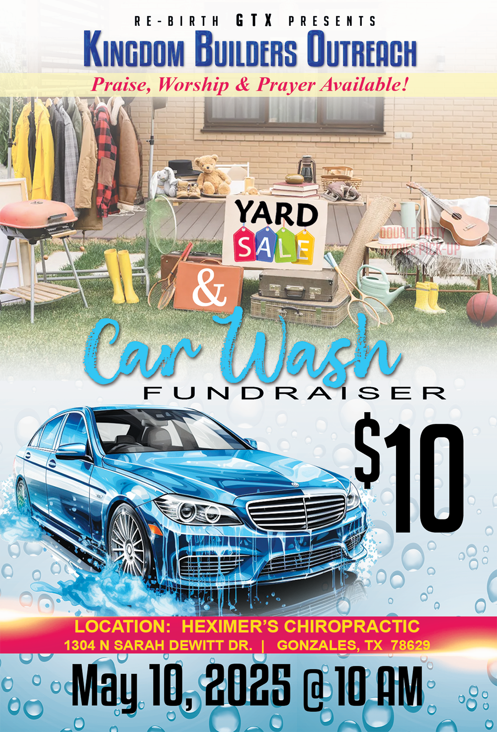 Re-Birth Apostolic Ministries GTX Outreach Team will be hosting their Yard Sale/Car Wash Fundraiser to help the continuation of the growth of outreach and our church.