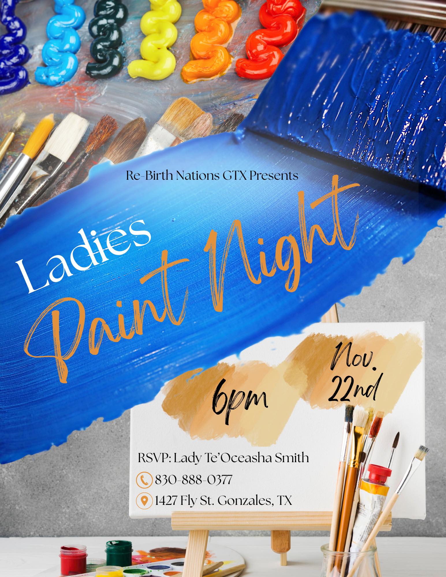 Re-Birth Nations GTX Kingdom Women are hosting their Ladies Paint Night. This is a night where women of all background come together and paint while sharing powerful testimonies from life experiences.