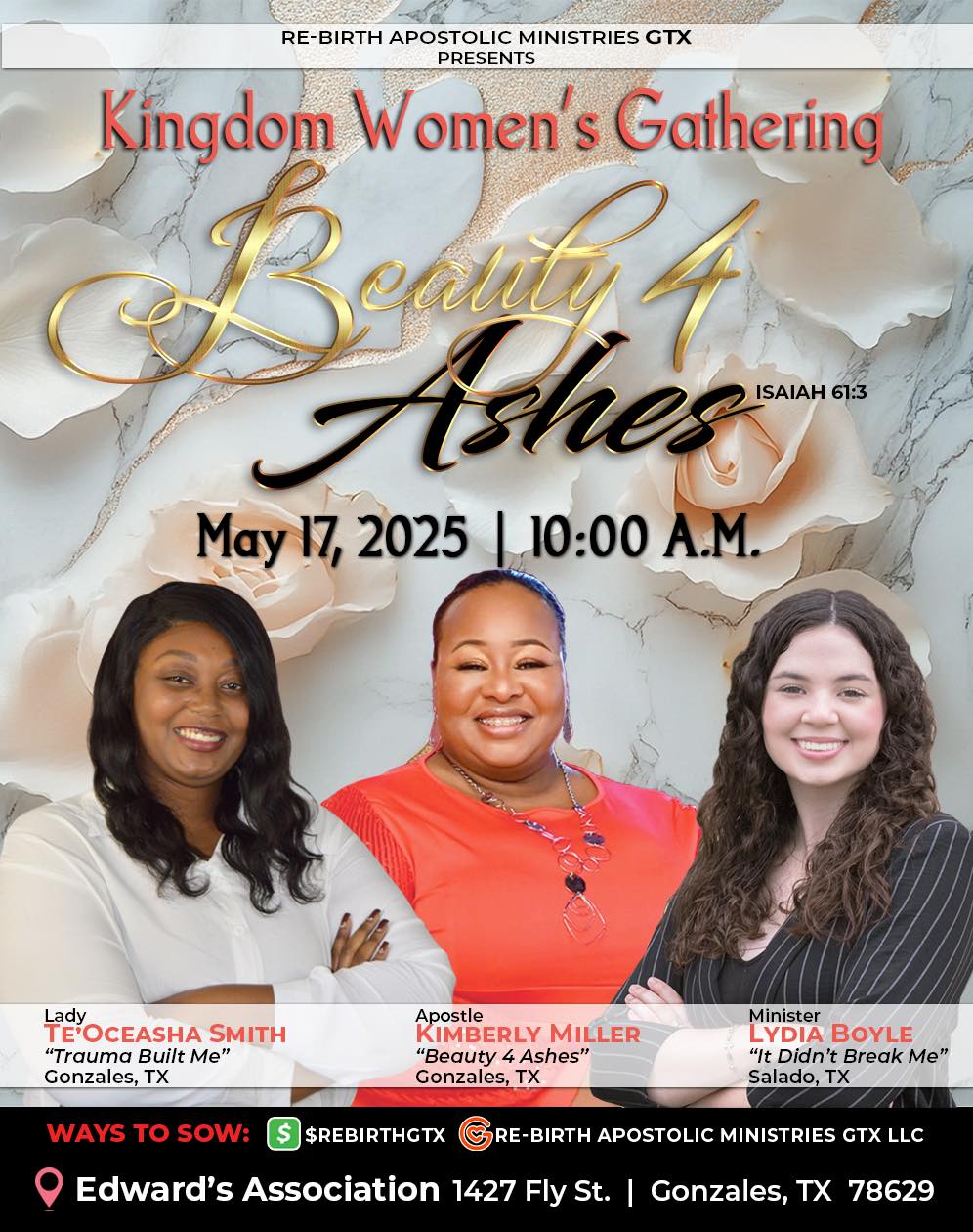 Join us for a "POWERFUL" move of God at our "Beauty 4 Ashes" Conference. Featuring guest speakers Lady Te'Oceasha Smith, Minister Lydia Boyle, and our very own Apostle Kimberly Miller as they dive in on "Real Life" topics you do NOT want to miss!