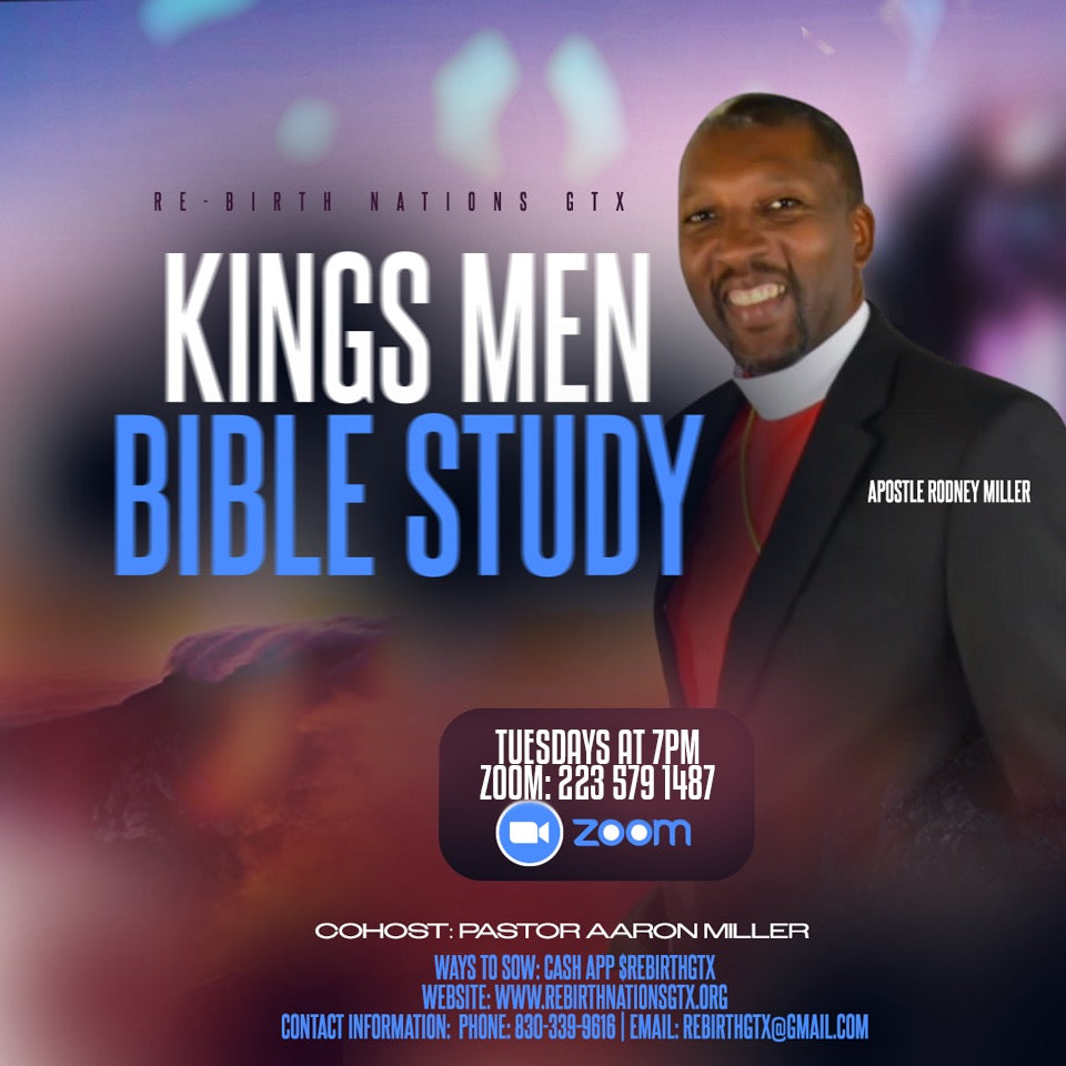 The King's Men weekly bible study is a virtual gathering that happens every Tuesday at 7 p.m. It is a safe space online for men to grow together, learn, and teach the Word unto one another. All men are welcome!